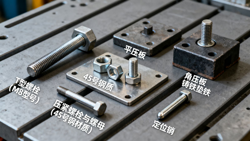 压紧螺栓与螺母:配合压板使用,通过旋转螺母推动压板压紧工件,常见材质为 45 号钢,保证足够压紧力。