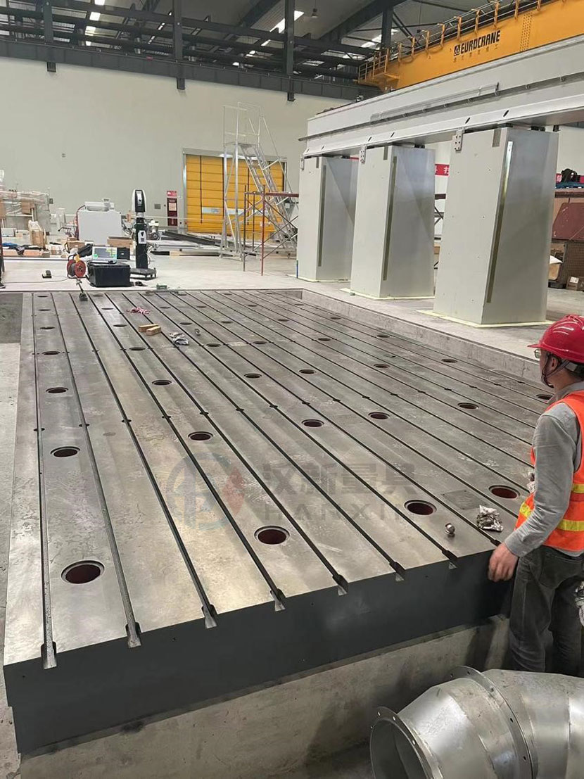 汉新铸造量具为吉林德阳某重工设计制造的重型3000*6000mm和3000*8000mmT型槽铸铁平台产品各6块
