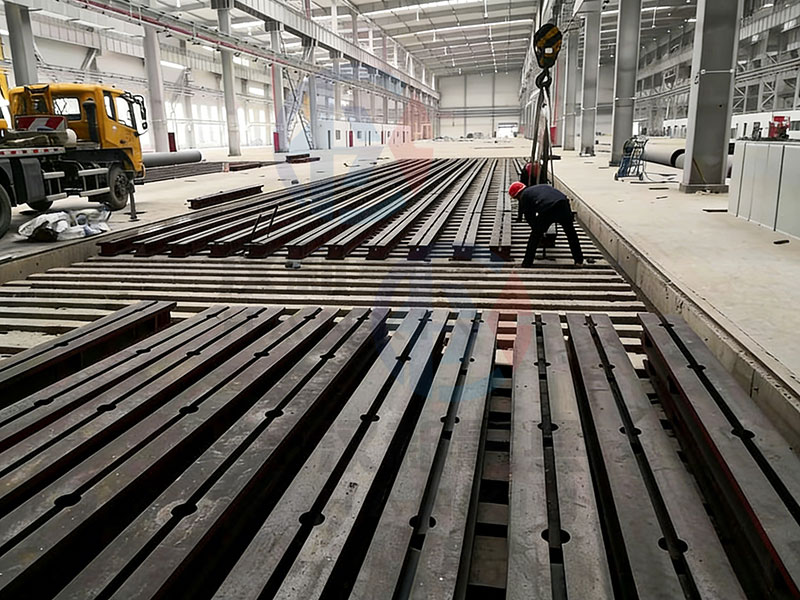 重载抗变形的结构设计:选用 HT300 高强度铸铁,经 650℃二次时效处理消除内应力,地轨单段承重可达 30吨而无挠度变形。安装现场可见,地轨采用“T 型槽 + 加强筋”复合结构,预留的吊装定位孔与汽轮机缸体吊点完美对齐,大幅提升装配效率。
